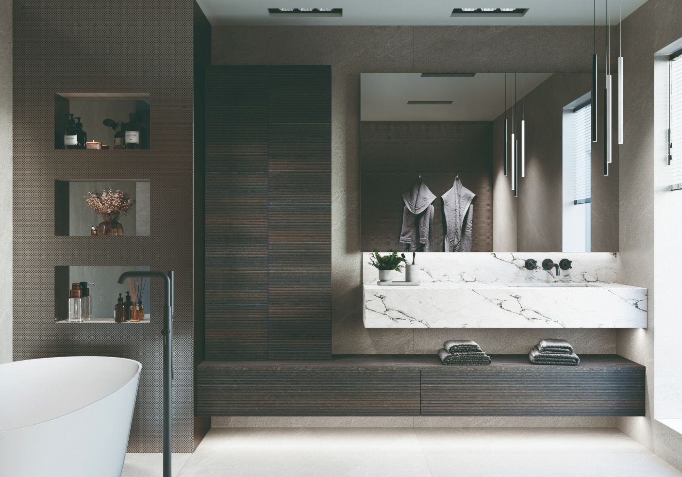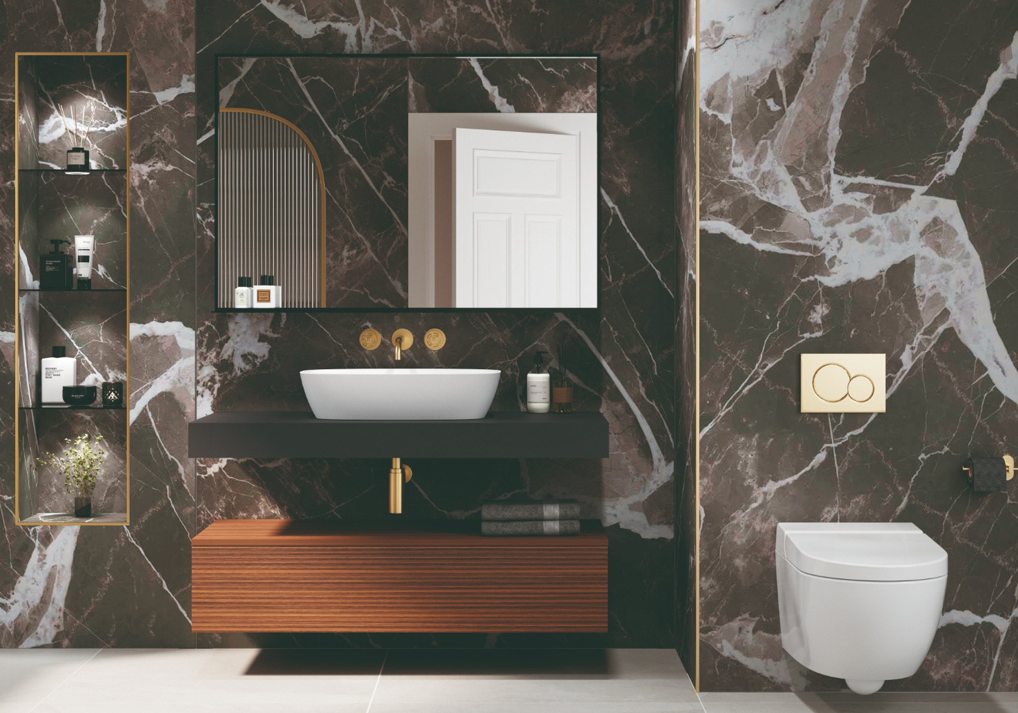 The Rietta Collection is defined by its balance of elegance and functionality, offering clean lines and refined proportions that create a calm, contemporary atmosphere. Designed for versatility, it combines porcelain console tops, sleek Blum soft close drawer units, branded internal accessory trays, tall storage units, and mirrors to form a cohesive yet customisable look. With 38 different finishes ranging from high-gloss and matt to rich lacquer and natural veneers, Rietta reflects a design ethos of understated luxury — a collection that transforms everyday routines into moments of indulgence. – Made in UK